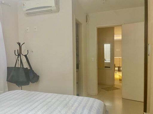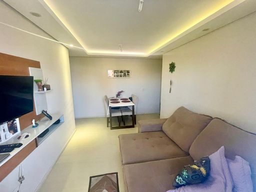 65m² com 2 dormitórios sendo 1 suíte com ar condicionado 🛏️, sala com varanda 🌿, cozinha planejada 🍽️, lavanderia e 1 vaga de garagem coberta 🚗