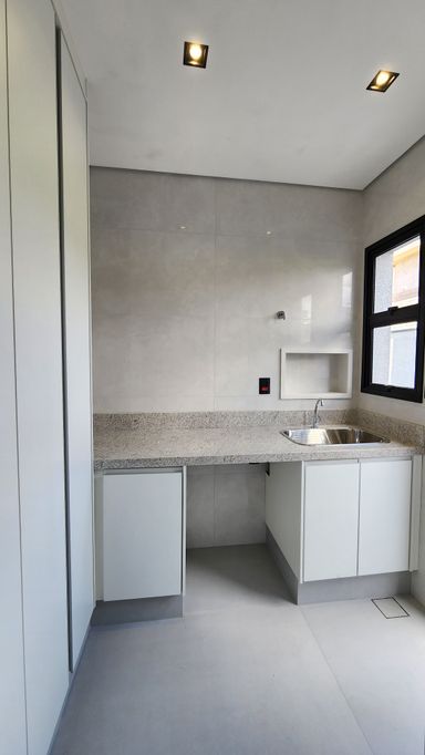 ▸ Lavanderia com tanque inox embutido, pedra e planejados