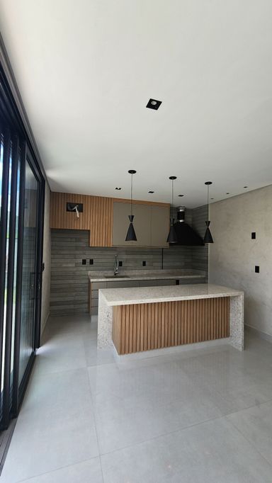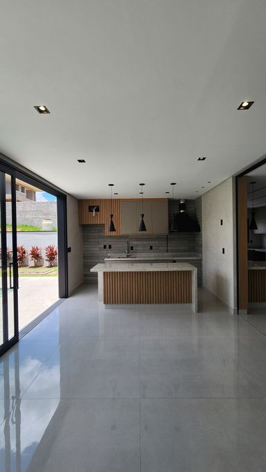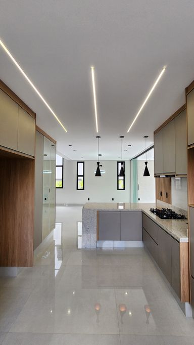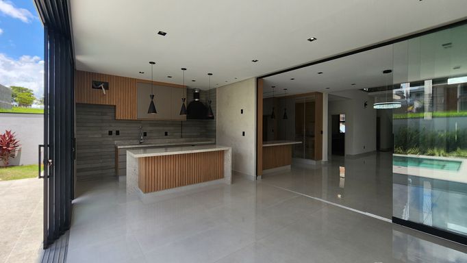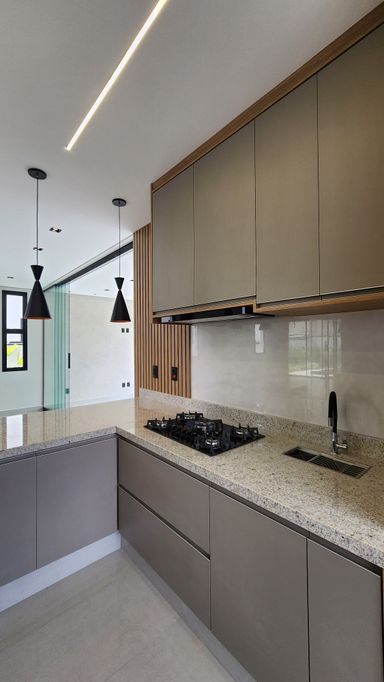 ▸ Cozinha ampla integrada ao gourmet (separados por porta de vidro) com móveis planejados, cooktop e coifa