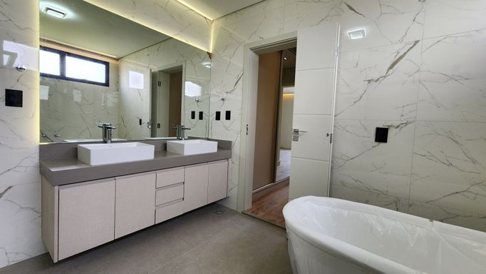 ▫ 1 suíte master com closet, banheira de imersão com Air Blower, cromoterapia LED, box duplo e varanda, com ar-condicionado