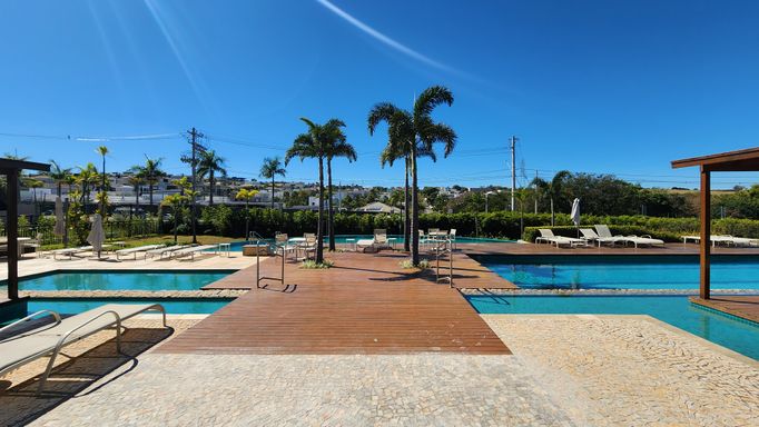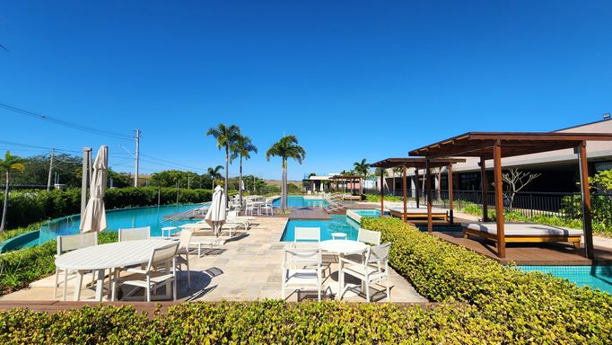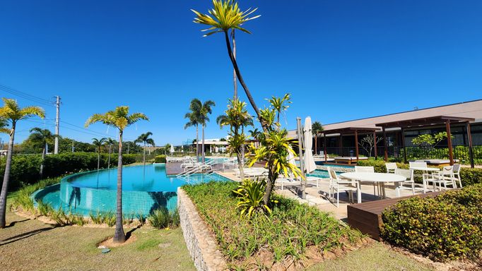 🏊♂️ Piscinas com borda infinita, raia dupla semiolímpica, deck molhado, solarium e pergolados à beira da piscina
