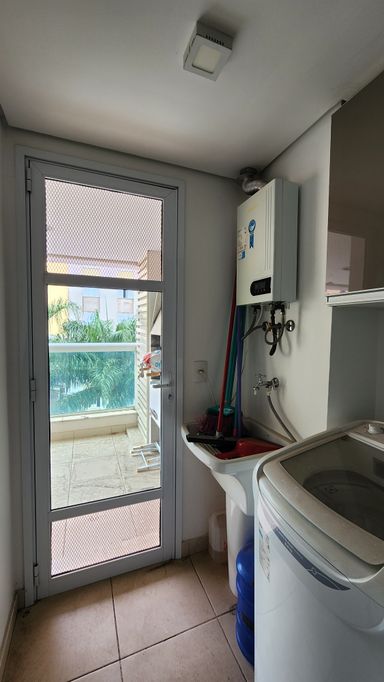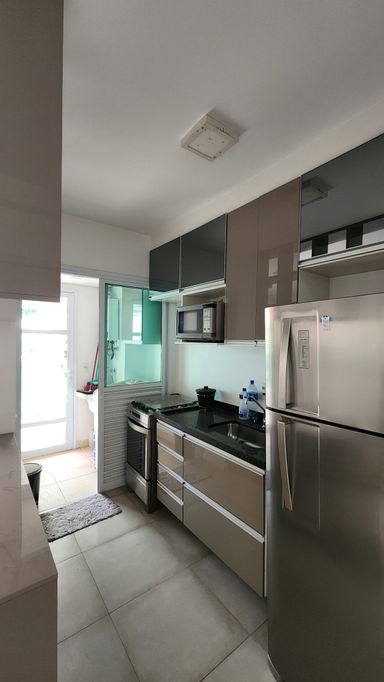 ▸ Cozinha com armários planejados, geladeira, fogão, micro-ondas, máquina lava e seca e aquecedor a gás